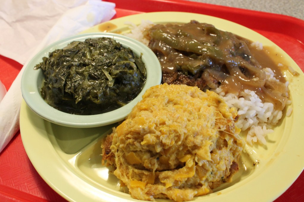 Hamburger Steak and Gravy with Collard Greens and Squash Casserole Sides – Photo by Kyle Tucker @kyle.tucker86